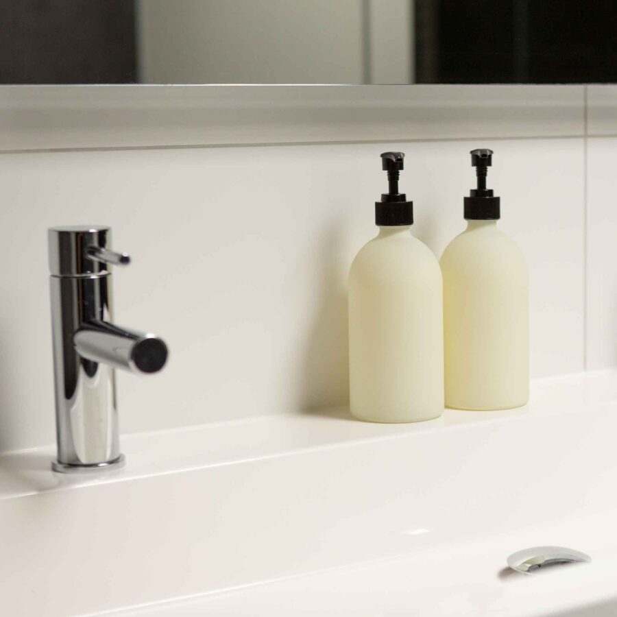 De glazen dispenser met kunststof pompje is gemaakt van 100% gerecyclede producten. Dankzij het feit dat de pomp van kunststof is, weten we zeker dat deze niet vast komt te zitten of roest onder de stromend water uit de douche.